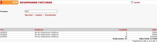 Si desea desaprobar otra factura, debe dar clic sobre Limpiar, para borrar de la pantalla