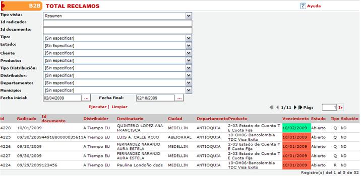 Esta página permite consultar los reclamos existentes dentro de