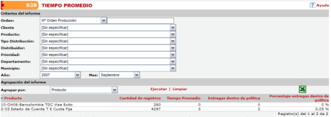 Esta página permite crear reportes de consulta del tiempo promedio de entrega de un producto, desde la existencia del producto como tal hasta la entrega a su destino final.